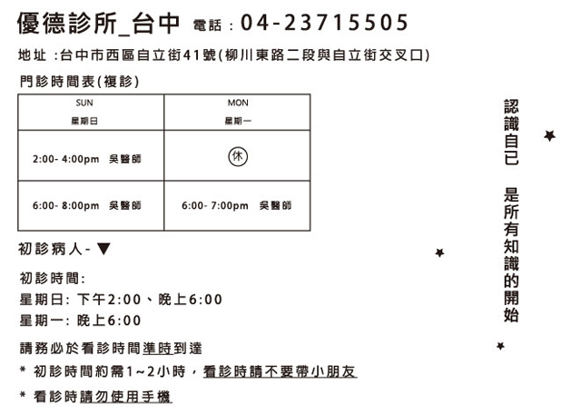 - 初診請先電話預約時間,需要約一個小時,請準備充裕的時間,謝謝您!